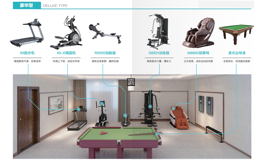 3、豪华型:X6跑步机+X5-E椭圆机+R5000划船器+G6501综合训练器+M9800按摩椅+美式台球桌