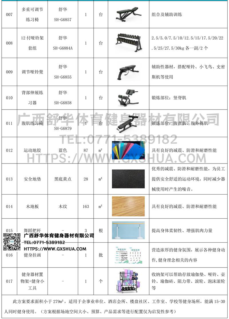 此方案要求面积小于279m²,适用于企事业单位、酒店会所、楼盘社区、工作室、学校等健身场所,能满15-30人同时健身使用。(方案根据场地空间大小、预算、产品需求等进行配置仅为启发性参考)