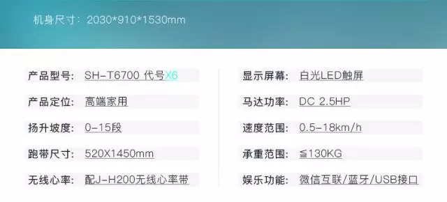 较大的跑带面积能让运动者带来舒适的运动跑感, 首先,我们先看一下官方给出的一些参数表 :